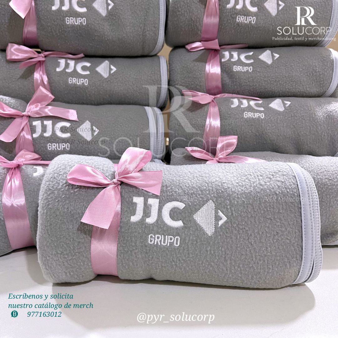 - 1 manta polar viajera 1.60m x 1m con bordes remallados – logo bordado en un extremo – decoración con lazo de tela satinada (color a escoger).